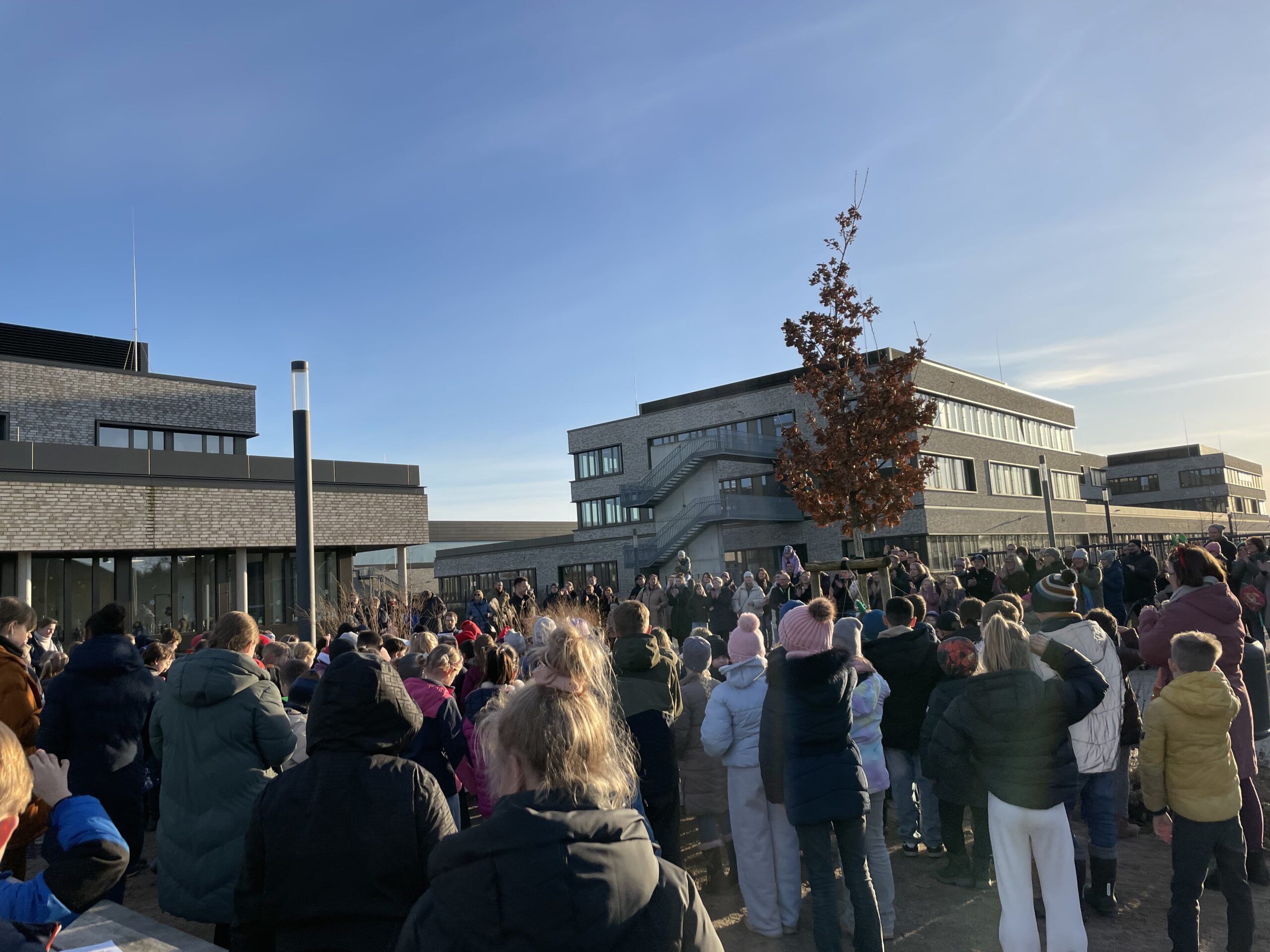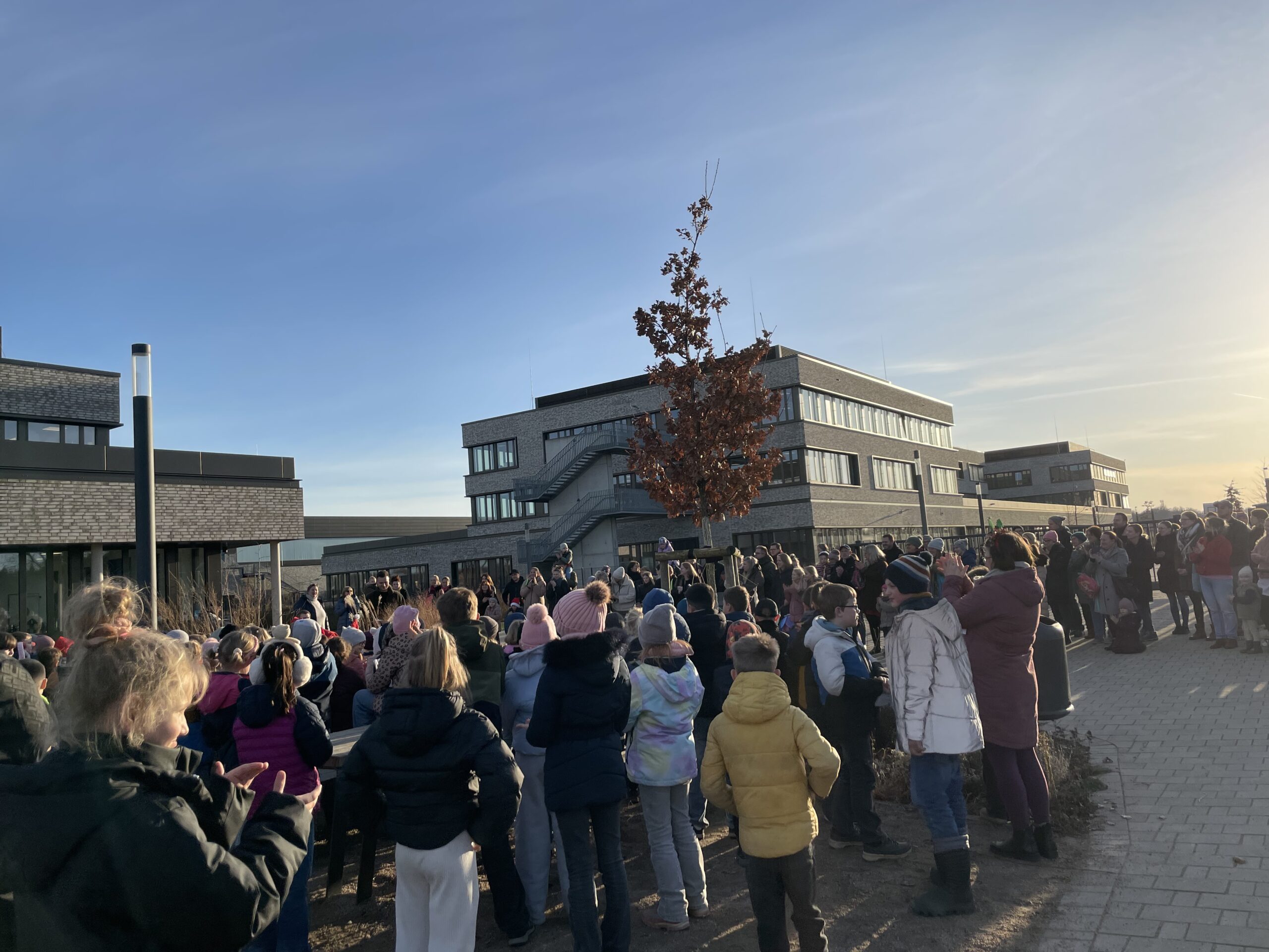 Kurz vor Weihnachten war es soweit. Wir übten regelmäßig als ganze Schulgemeinschaft mit den Vorschulkindern Winterlieder in der Aula zu singen. Das war schon immer schön, doch nun wurde es am Dienstag vor den Ferien noch einmal etwas aufregend: Wir haben die Lieder auf dem Schulhof unseren Eltern und Familien vorgesungen. Sogar das Klavier wurde dafür nach draußen befördert. Zum Glück spielte das Wetter mit und wir konnten wunderbar unter freiem Himmel singen. Doch wir haben nicht nur gesungen, einige Lieder wurden mit Tanzschritten gestaltet. Was für eine schöne Aktion unter freiem Winterhimmel.