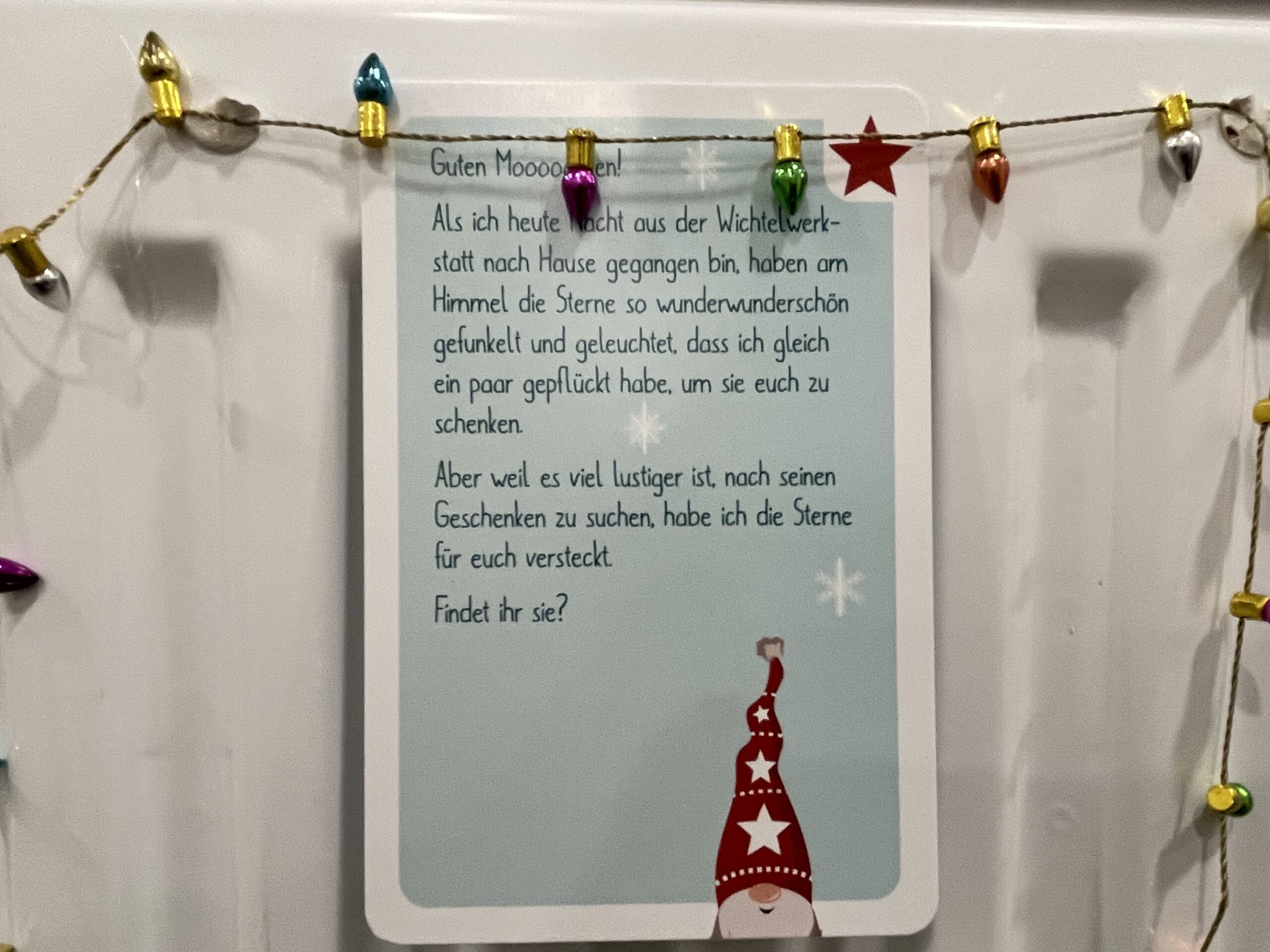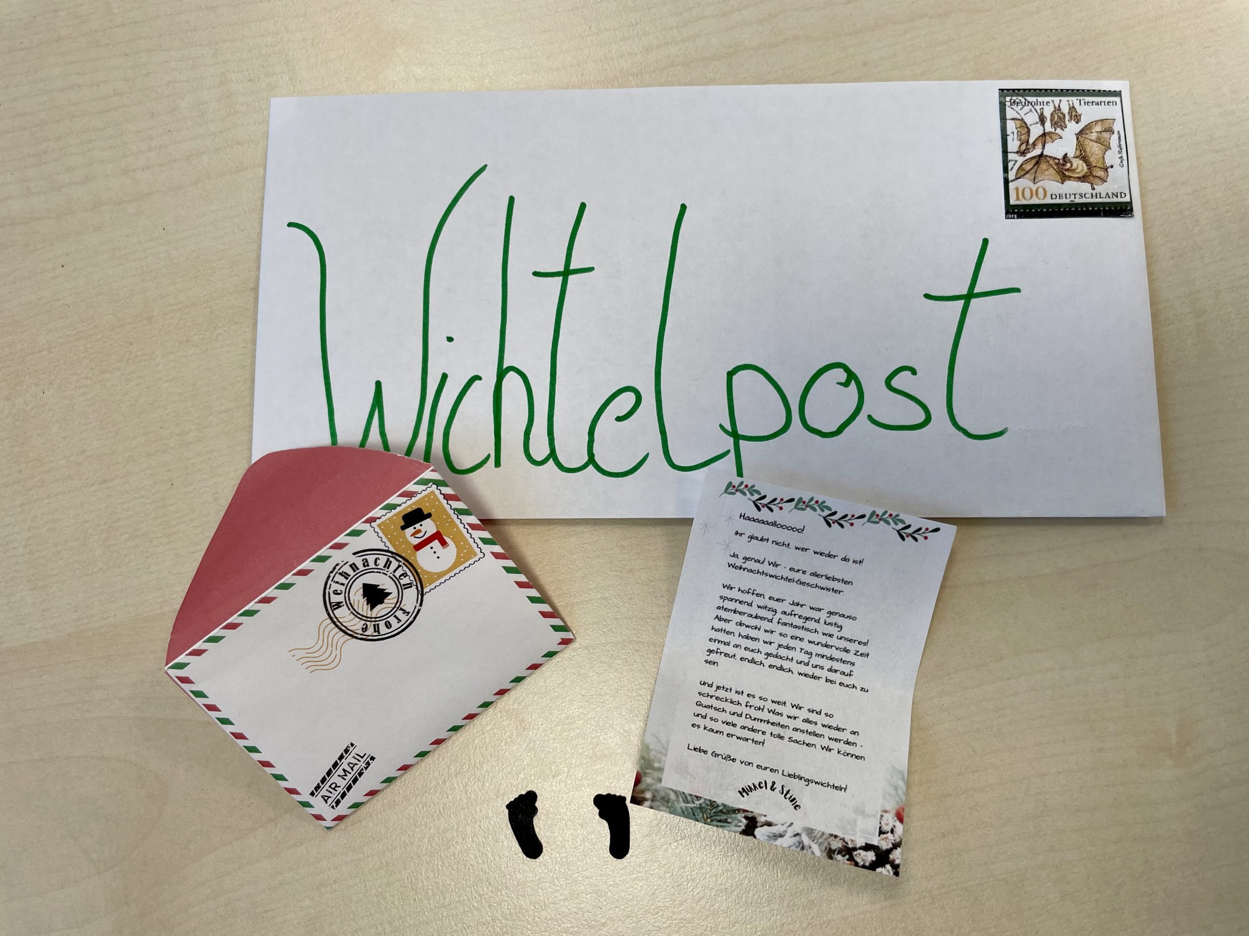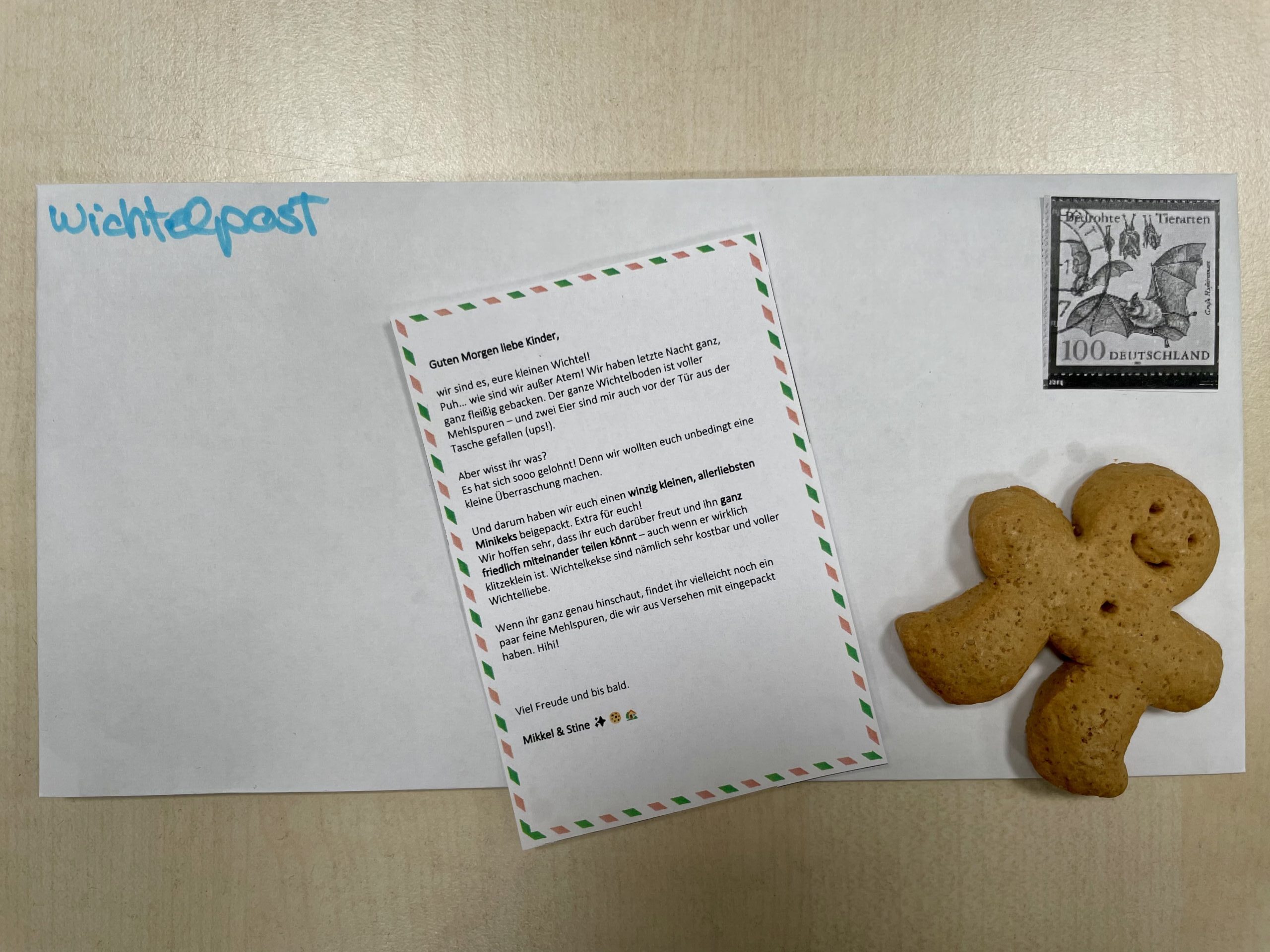 Die Wichtel schrieben während ihrer Besuchszeit drei Briefe an die Klassen. Auf den  Briefmarken waren immer die passenden Klassentiere zu sehen, was die Kinder besonders spannend fanden. Einmal gab es den Auftrag einen gebackenen Wichtelkeks gerecht aufzuteilen, so dass jedes Kind etwas davon abbekommen würde. Ein anderer Auftrag war, im ganzen Schulhaus Sterne zu suchen. Die letzte Wichtelpost war etwas ganz Besonderes: Die Geheimschrift konnte nur mit einer speziellen Lampe gelesen werden. Das sorgte für Spannung und staunende Gesichter.